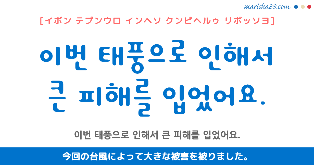 | 韓国語ハングル | 이번 태풍으로 인해서 큰 피해를 입었어요.韓国語の発音を聞く |