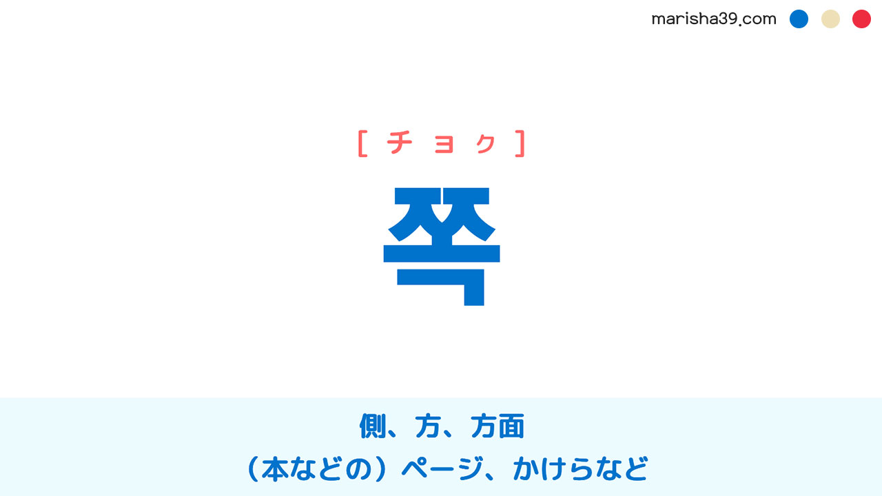 韓国語【쪽】[チョッ] [チョク] 側、方、方面、(本などの)ページ、頁、かけら、後ろでまとめた髪の毛、[俗語] 顔